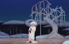 suddenly transformed onstage into a bald blind masseur. She gave a tap with the wisteria branch
